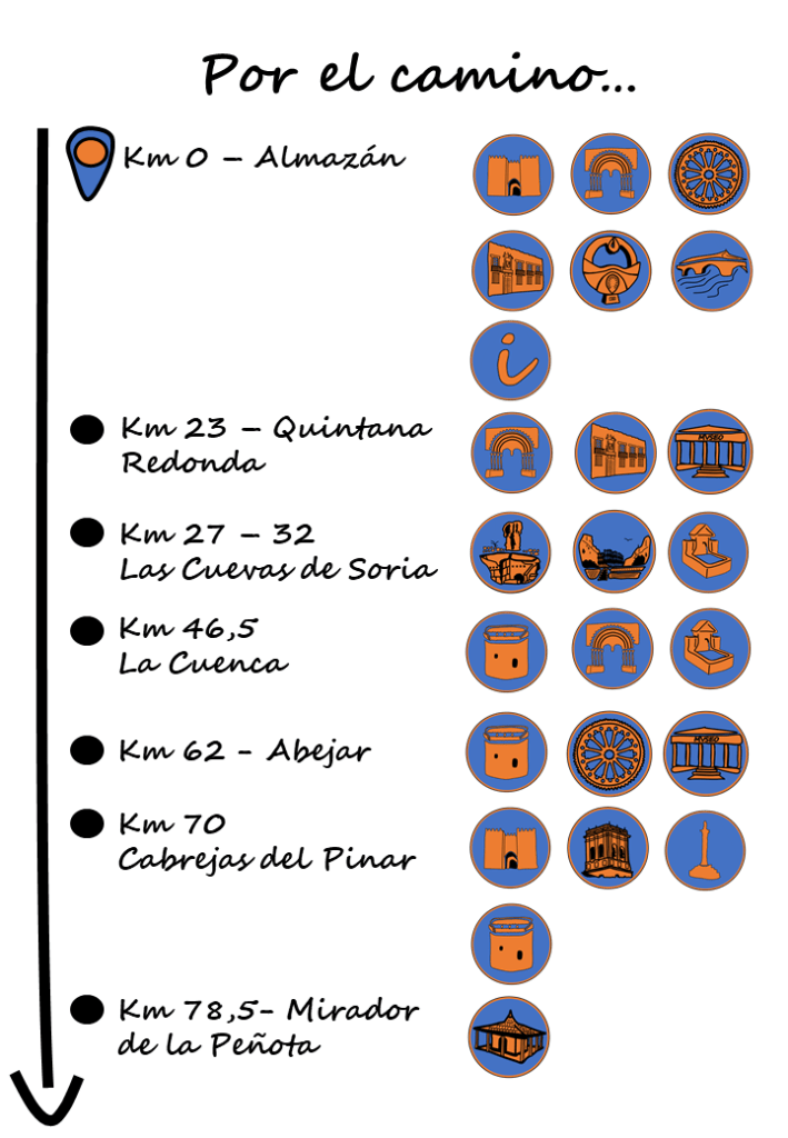 El Km 0 de la ruta se encuentra en la Plaza Mayor de Almazán., cuyo nombre, de origen árabe, significa “el fortificado”.
