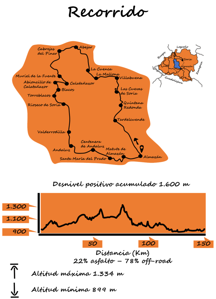Con unos 150 Km de recorrido, se puede plantear para un plan de dos o tres días, bien con bicicleta MTB o gravel, pedaleando principalmente por caminos.