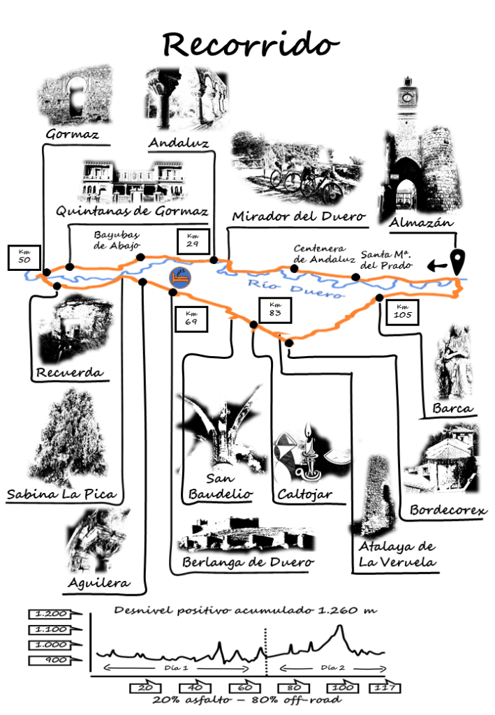 El entorno natural de las riberas de los ríos Duero y Escalote con sus arboledas, pinares y cultivos, así como la Sierra de Bordecorex, nos van a permitir ir conectando los distintos pueblos y lugares a nuestro paso. La gastronomía soriana, ideal para cicloturistas, y en especial sus torreznos, serán nuestro avituallamiento y principal fuente de energía para afrontar los kilómetros que nos aguardan.