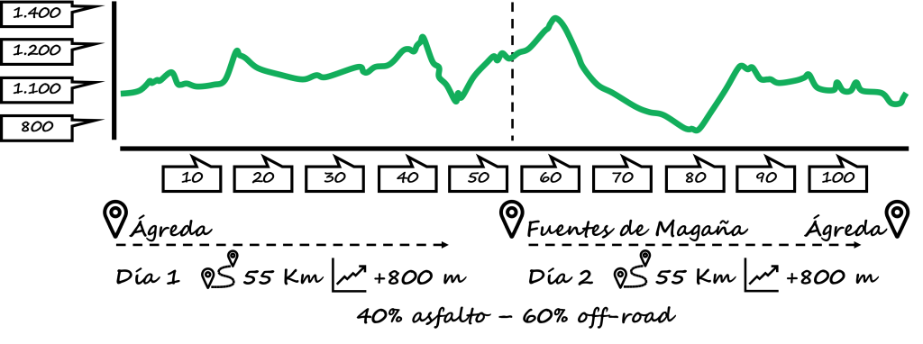 El trazado total de la ruta, de 110 km, principalmente off-road, se divide en dos etapas, de unos 55 km cada día y dificultad similar.