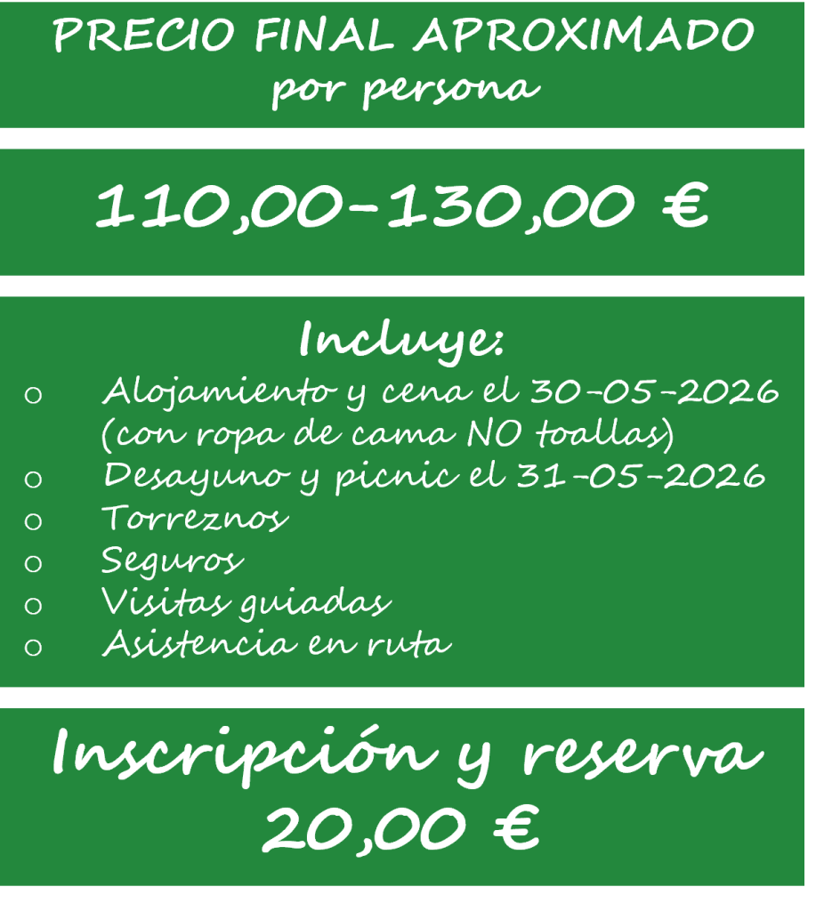 LLEGADA ESTIMADA: prevista el domingo 31 de mayo sobre las 17:00 h al mismo lugar de la salida el día anterior.